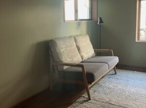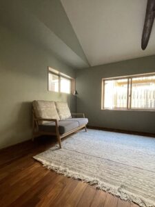 壁の淡いグリーンのペイントと、お手持ちのラグともぴったりで、とても素敵な空間になりました。