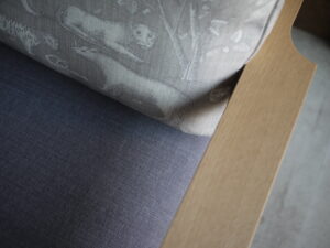 今回は茶色い塗装をそのままに(綺麗に磨いています)、肘の籐も新しい物に巻き直して、元々の雰囲気は残しつつ、座面は落ち着いたグレージュに。スコットランドのちょっと変わった織りのウール生地で張り替えました。