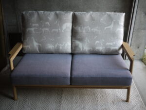 さて、受け取ったソファにウェービングテープを張って、用意していたクッションを乗せたら完成です。
