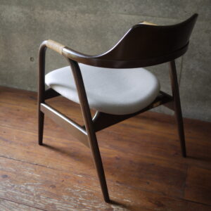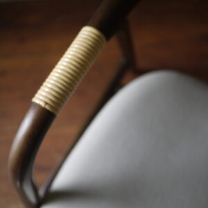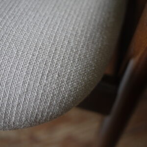 今回は茶色い塗装をそのままに(綺麗に磨いています)、肘の籐も新しい物に巻き直して、元々の雰囲気は残しつつ、座面は落ち着いたグレージュに。スコットランドのちょっと変わった織りのウール生地で張り替えました。