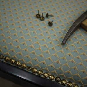 布地はこの鋲でとめるのではなく、先にタッカーで張って、それを隠すために鋲を重ねて留めるので、全部に鋲を打っていくとフレームが穴だらけになってしまいますよね。
