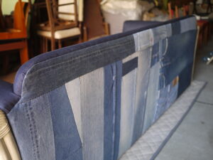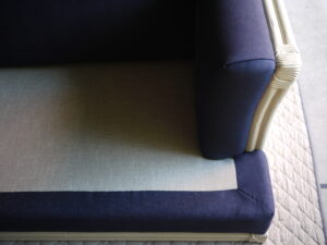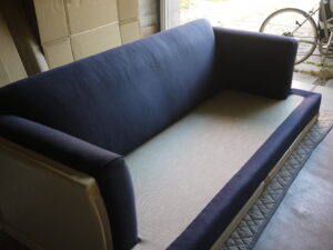 動かすのも大変ということで、座面、背もたれに置かれているクッションをご自身で直されて使われきたのですが、本体ももう限界。そんなわけで張り替えの依頼をいただきました。